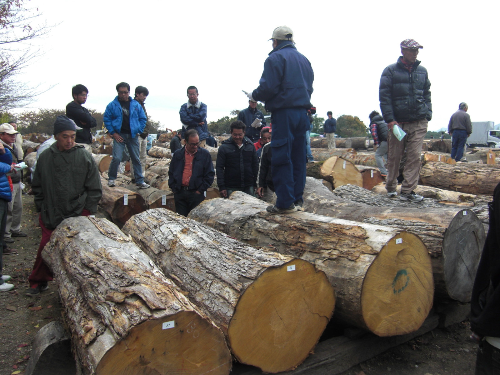 祈るような気持ちで組合で原木の切断…。