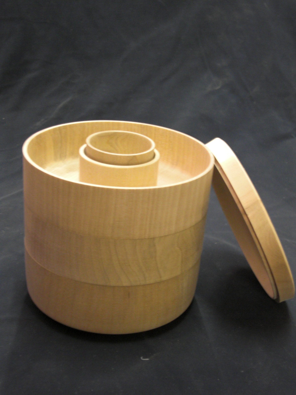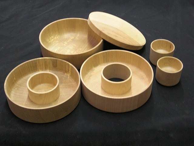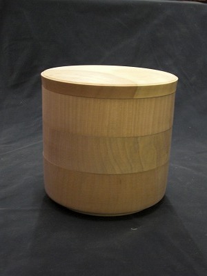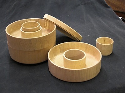 一見普通の3段重のように見えるが、蓋をあけると あらら…、中はドーナッツ状になってて中からぐい呑みが2個…。3っつの器にご馳走。ぐい呑みで飲み交わす…って算段になってます。材料は水目桜。15cm*15cmの手ごろなサイズです。(会場売値 25000円)