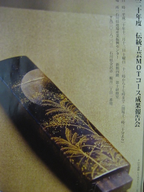 先週の土曜日は金沢で伝統工芸MOTコースの成果報告会でした。僕達はプレゼンの時間を10分間もらったのですが二人とも話してる最中に頭の中が真っ白になってしまいました。 僕達は普段、仕事をしている時は引きこもり状態なので、あんなに大勢の人を前に話すのはかなり緊張しました。前日は二人で頑張って練習したのに…。il||li▂█▀ฺ█●il||li 本当に限られた時間の中で人に解りやすく伝える難しさを知った二人でした。 そしてこんな二人に何度も夕方から夜遅くまで資料作りを手伝ってくれた緒方先生には本当に感謝です。
