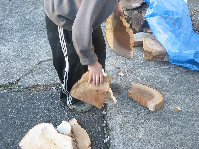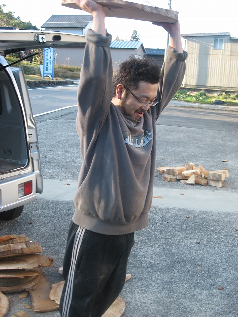 今年は思いのほか木端(こっぱ)の減りが早かったので、またまた材料屋さんに頂きにいきました。大きなものが多くて最初はチェンソーを使って細かくしていたのですが、量もあったので、いい加減ちまちま切ってるのが面倒くさくなった二人。その後は「おりゃ〜!」「うぉ〜!」って感じで叫びながら木を地面に思いっきり投げつける二人なのでした。(d゚ω゚d)オゥイェー♪