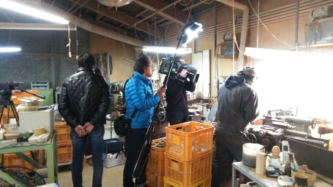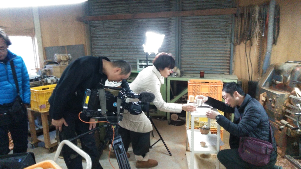NHK【イッピン】が、この「喜泉…ぐいのみシリーズ」の木部の制作風景を…ということで撮影にやってきました。2時間以上撮影しましたが放映時間は番組内の2〜3分とか…。