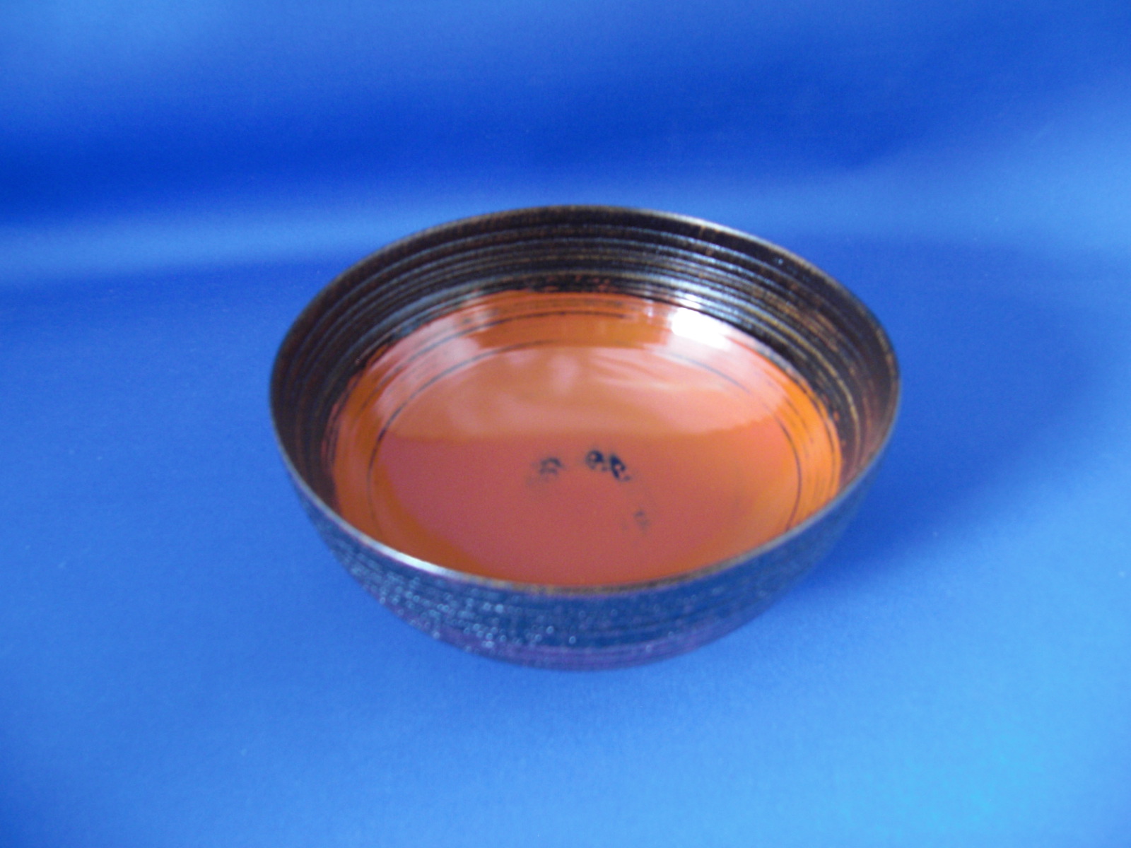 内は根来塗り、縁から外は黒摺漆で仕上げています。